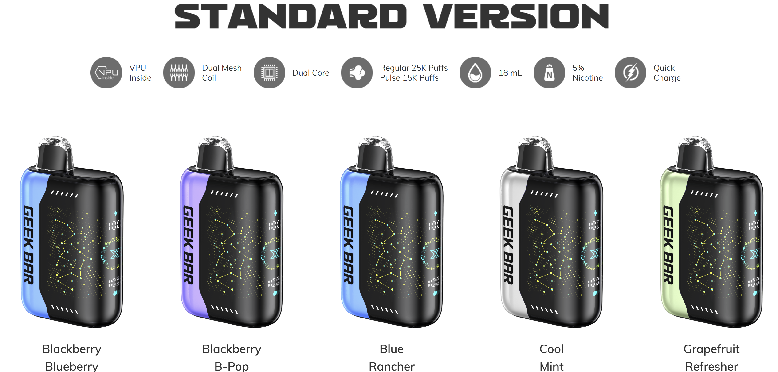 Geek Bar Pulse X 25000 Disposable Vape is a disposable kit with 25000 puffs, the complete version of Geek Bar Pulse 15000. It is the first disposable vape with a 3D-curved screen in the world. The high puff count is supported by the tremendous amount of e-juice and the consistent battery. Similar to other smart disposable vapes, Pulse X 25K has various vaping modes and allows for precise and easier control. However, Pulse X is more advanced with a dual-core processor with VPU Technology. It is time to unveil the mysteries of Geek Bar Pulse X 25000.