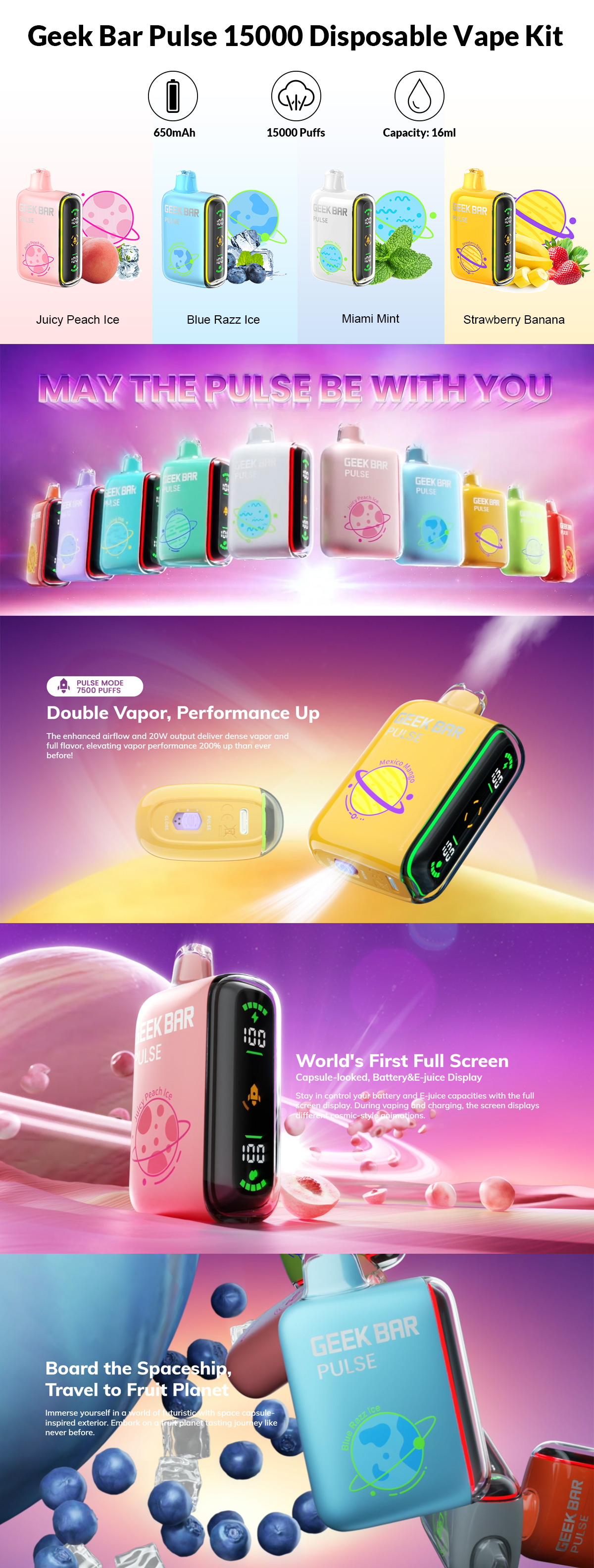 Geek Bar Pulse 15000 Disposable Vape is a pioneering disposable kit with a display screen and a Pulse Mode, pre-filled with 16ml vape juice and powered by a 650mAh battery. Geek Bar Pulse has the world's first full-view screen that shows battery status and e-juice level in detail. If you are looking for richer and long-lasting flavor, just turn on the pulse mode. Dual mesh coils work simultaneously to double the output power. A vivid animation of a rocket will show up on the screen. The new Zodiac Series is also available.